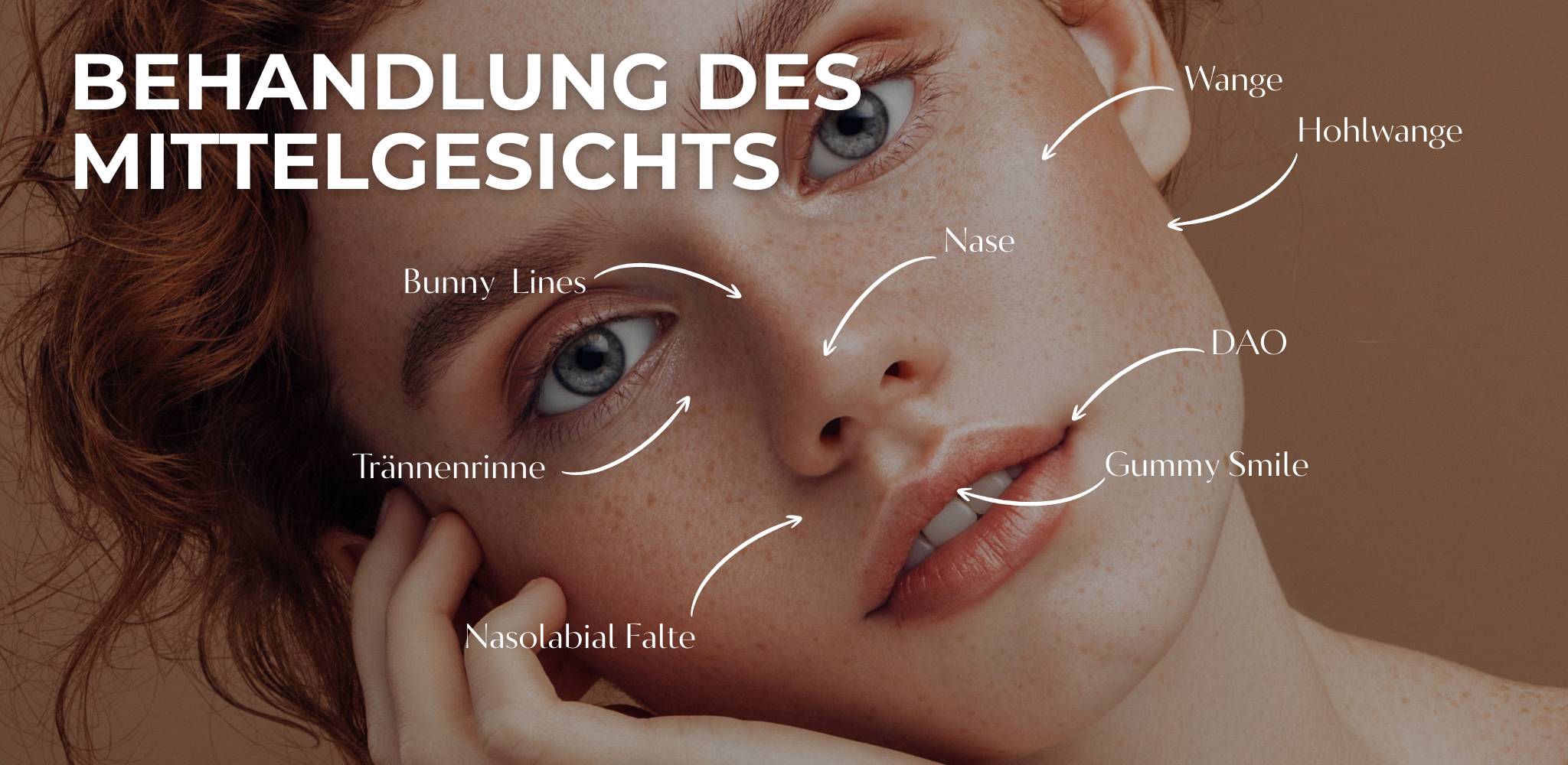 - Indikationen: Wangenaufbau, Tränenrinne, Jochbogen, Kieferkontur und Volumenverlust
