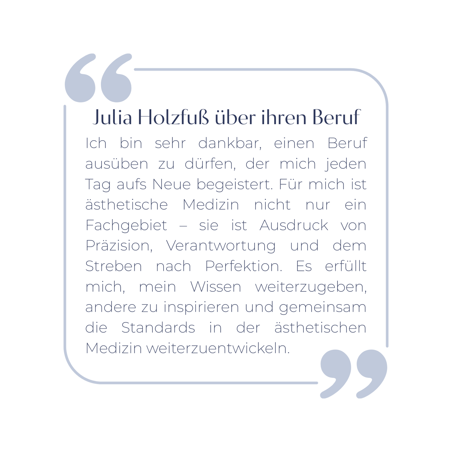 Julia Holzfuss ist seit 2008 Ärztin und heute eine renommierte Expertin im Bereich der ästhetischen Medizin. Was einst als Interesse begann, entwickelte sich über die Jahre zu einer echten Passion: die Verbindung von medizinischer Präzision und ästhetischem Feingefühl. Seit 2015 hat sie sich systematisch auf diesem Fachgebiet weiterqualifiziert und tiefgreifende praktische Erfahrungen gesammelt.